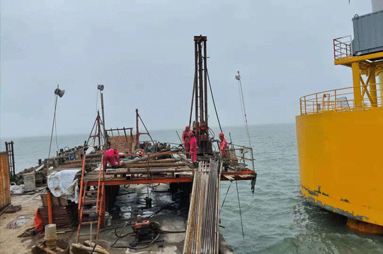 该技术改变传统局限于陆地环境的地基处理方法,并创造性地在海上实现高精准斜孔钻进,在此基础上研发了海洋低压斜孔注浆、海洋高压旋喷斜桩、海洋水泥搅拌桩等技术综合应用,并在海上风电场的在役风机斜桩基础加固桩周土层,实现最佳固化效果,有效提高桩基础承载力,保障海上风电场的安全运行。目前,该技术已成功应用于多个海上风电场。